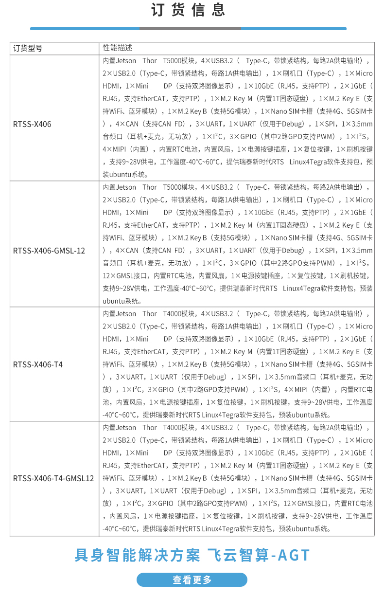 • 产品描述:飞云智盒 RTSS-X406 是一款面向人形机器人与低延时具身智能系统的工业级边缘计算平台,基于 NVIDIA Jetson Thor T5000/T4000,最 高提供 2070 TFLOPS 的 AI 推理算力,支持大型Transformer 与具身智能模型的本地实时运行。RTSS-X406 兼顾高算力、实时性、可拓展性、大容量存储与可靠性设计,是复杂智能系统的高性能计算平台。