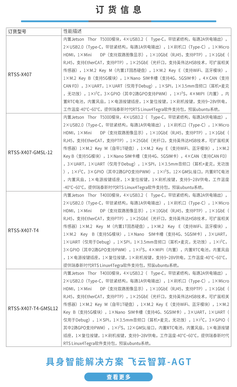 • 产品描述:飞云智盒 RTSS-X407 是一款面向人形机器人与低延时具身智能系统的工业级边缘计算平台,基于NVIDIA Jetson Thor T5000/T4000,最高提供 2070 TFLOPS 的 AI 推理算力,支持大型 Transformer 与具身智能模型的本地实时运行。RTSS-X407 兼顾高算力、实时性、可拓展性、大容量存储与可靠性设计,是复杂智能系统的高性能计算平台。