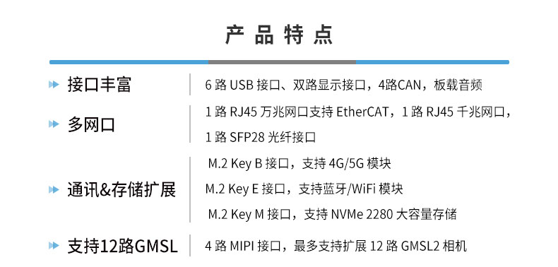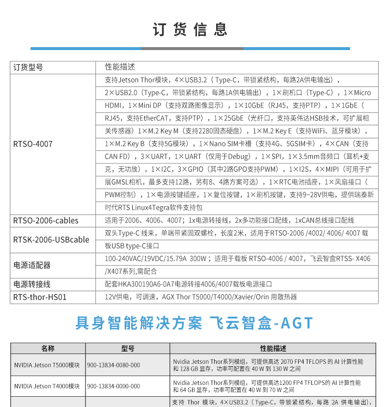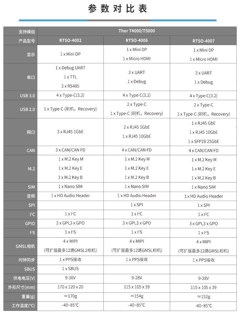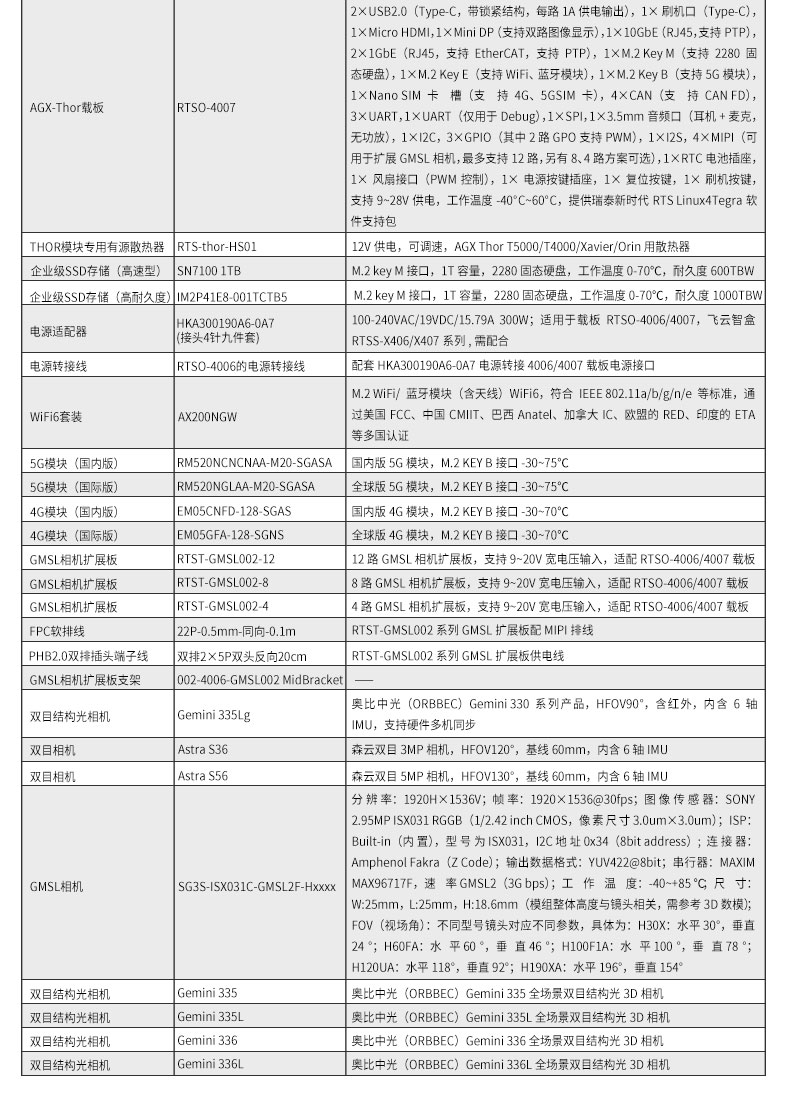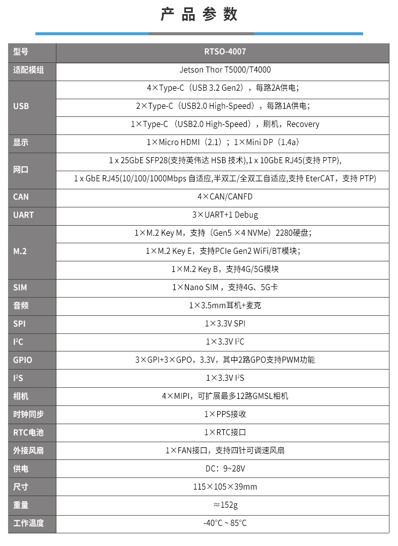 • 产品描述:RTSO-4007是针对NVIDIA Jetson Thor模组的工业级载板,产品集成6路USB、万兆网、4路CAN/CANFD及12路GMSL相机支持等丰富接口,并支持Gen5 NVMe硬盘。其采用紧凑型设计,支持宽压供电(9-28V)并拥有-40℃至85℃的宽温工作能力,确保了工业级的可靠性与耐用性。
