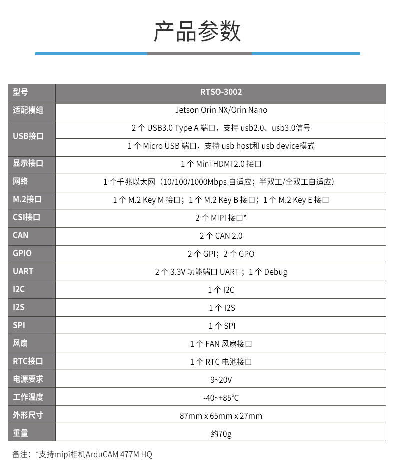 • 产品描述:RTSO-3002 是专门为 NVIDIA Jetson 平台边缘计算现场部署算力,支持Super 模式,进行 AI 推理应用而设计的嵌入式工业级载板,采用工业级元器件,具有超长 MTBF,接口功能丰富,低功耗,安全级别高等特点,工作温度为-40℃— +85℃,适合现场 7 x 24 小时长时间稳定运行,可满足各种现场部署苛刻条件。