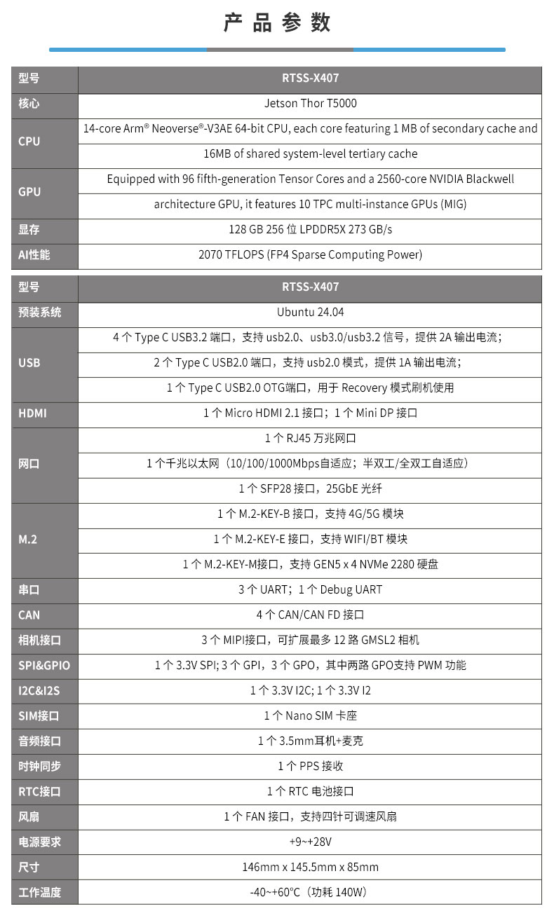 • 产品描述:飞云智盒RTSS-X407是一款由瑞泰新时代推出的高性能边缘计算产品。其核心搭载NVIDIA Jetson Thor 5000模组,提供高达2070 TFLOPS(FP4 - Sparse Computing Power)的强劲AI算力,专为苛刻的工业应用场景设计。产品具备良好的连接性与扩展能力,集成6路USB、万兆网、光纤、4路CAN/CANFD及12路GMSL相机等丰富接口,并支持Gen5 NVMe硬盘。采用紧凑型设计,支持宽压供电(9-28V)并拥有-40℃至60℃的宽温工作能力(功耗140W),确保了工业级的可靠性与耐用性。飞云智盒RTSS-X407是人形机器人、驱动智能制造、智慧物流、特种作业、智慧医疗及科研教育等领域智能化升级的理想硬件平台。