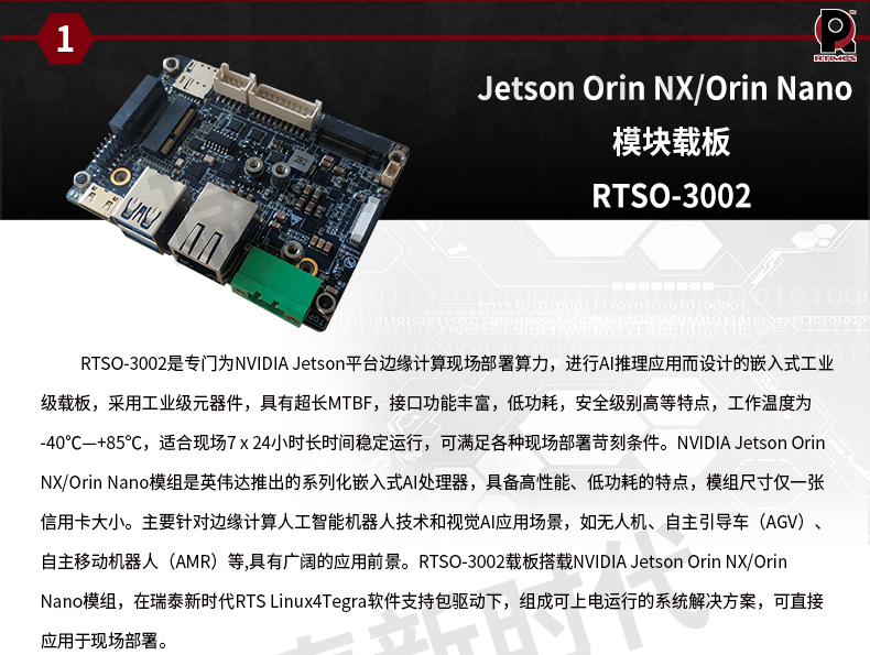 • 产品描述:RTSO-3002 是专门为 NVIDIA Jetson 平台边缘计算现场部署算力,支持Super 模式,进行 AI 推理应用而设计的嵌入式工业级载板,采用工业级元器件,具有超长 MTBF,接口功能丰富,低功耗,安全级别高等特点,工作温度为-40℃— +85℃,适合现场 7 x 24 小时长时间稳定运行,可满足各种现场部署苛刻条件。