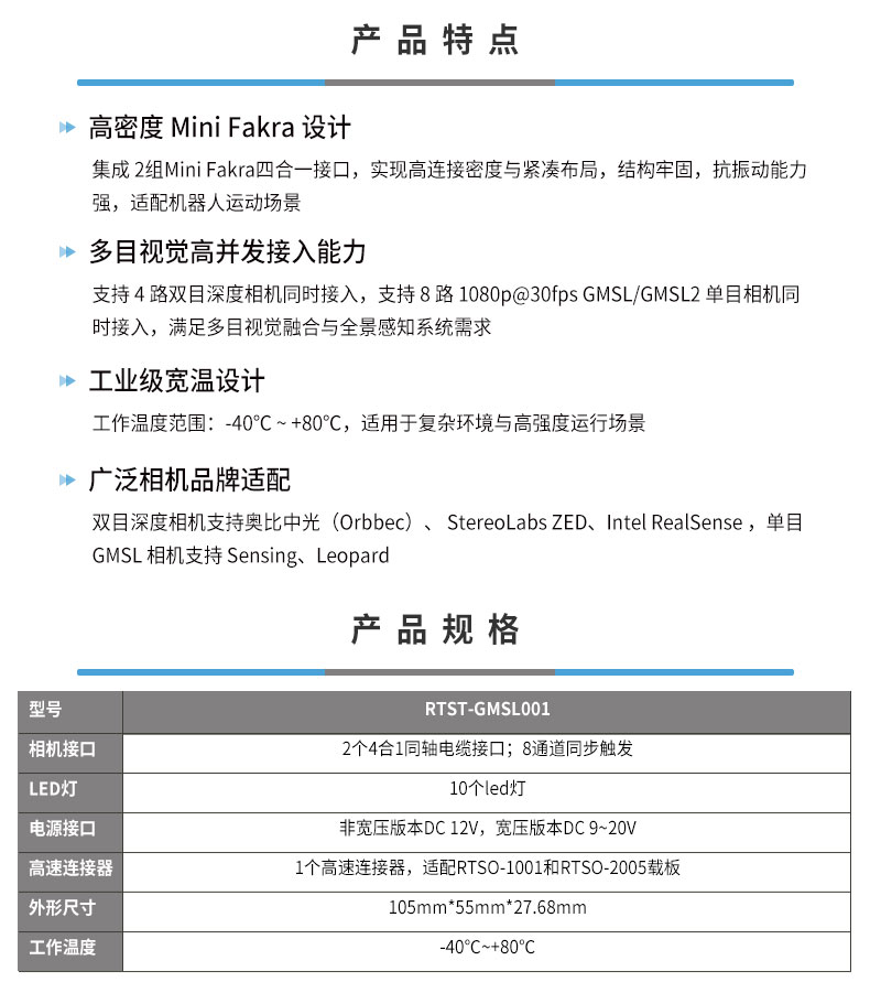 • 产品描述:RTST-GMSL001相机拓展板采用紧凑型工业化设计,支持 -40℃~80℃ 宽温工作环境,面向人形机器人与具身智能多目视觉系统而开发。该拓展板专为 RTSO-1001和RTSO-2005系列载板提供 GMSL2 相机接口扩展能力。产品支持主流 GMSL2 单目与双目深度相机接入,兼容奥比中光(Orbbec)、 StereoLabs ZED、Intel RealSense、森云(Sensing)、 Leopard 等品牌相机。系统最多 可 同 时 接 入8 路 GMSL/GMSL2 单 目 相 机(1080p@30fps)或4路双目深度相机,为多目视觉融合、环境感知与空间定位应用提供高带宽、高可靠性的接口扩展方案。