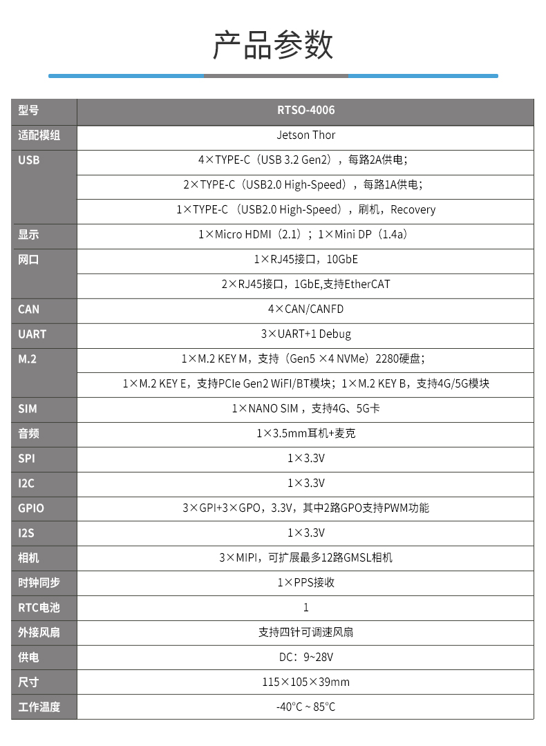 • 产品描述:RTSO-4006是针对NVIDIA Jetson Thor模组的工业级载板,产品集成6路USB、万兆网、4路CAN/CANFD及12路GMSL相机支持等丰富接口,并支持Gen5 NVMe硬盘。其采用紧凑型设计,支持宽压供电(9-28V)并拥有-40℃至85℃的宽温工作能力,确保了工业级的可靠性与耐用性。