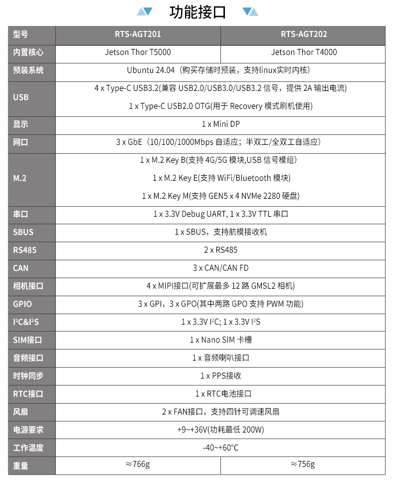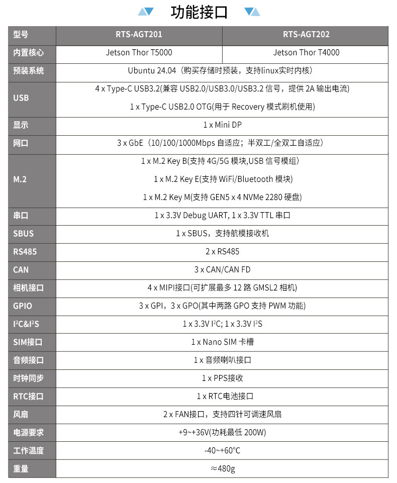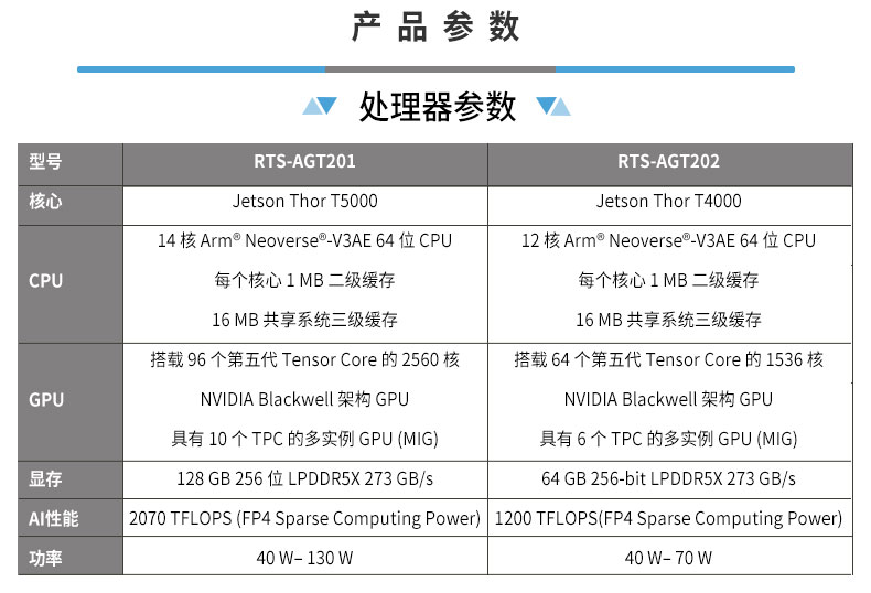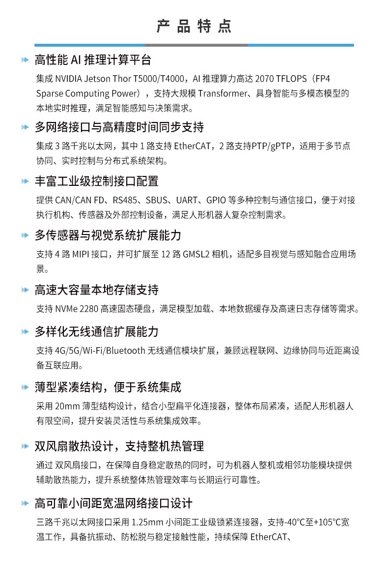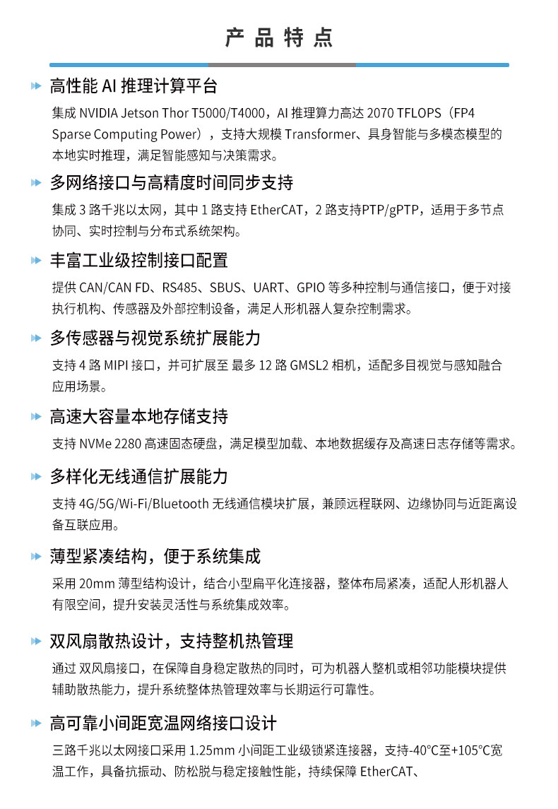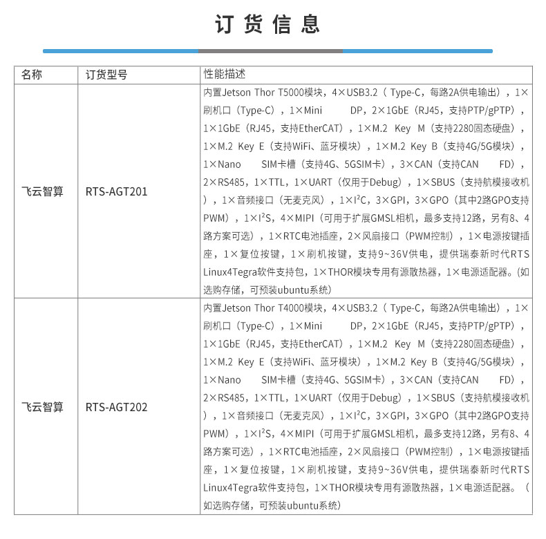 • 产品描述:飞云智算 RTS-AGT200 是瑞泰新时代自研的、面向人形机器人与低时延具身智能机器人大脑的一体化计算平台,基于 NVIDIA Jetson Thor T5000/T4000 平台打造,集成工业级载板、计算模组与散热系统,采用薄型紧凑结构设计,可灵活适配人形机器人等空间受限的集成环境。
