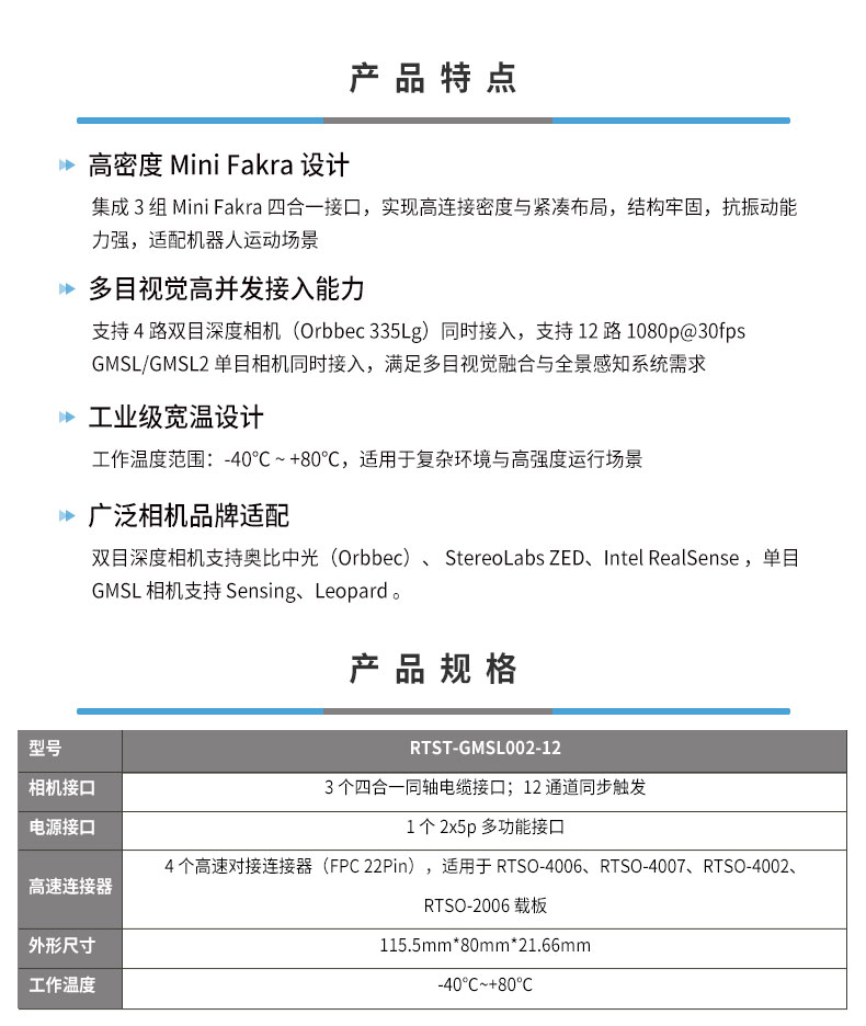 • 产品描述:RTST-GMSL002-12相机拓展板采用紧凑型工业化设计,支持 -40℃~80℃ 宽温工作环境,面向人形机器人与具身智能多目视觉系统而开发。该拓展板专为 RTSO-2006、RTSO-4006、RTSO-4007、RTSO-4002 系列载板提供 GMSL2 相机接口扩展能力。产品支持主流 GMSL2 单目与双目深度相机接入,兼容奥比中光(Orbbec)、 StereoLabs ZED、Intel RealSense、森云(Sensing)、 Leopard 等品牌相机。系统最多 可 同 时 接 入12 路 GMSL/GMSL2 单 目 相 机(1080p@30fps)或4 路双目深度(Orbbec 335Lg)相机,为多目视觉融合、环境感知与空间定位应用提供高带宽、高可靠性的接口扩展方案。