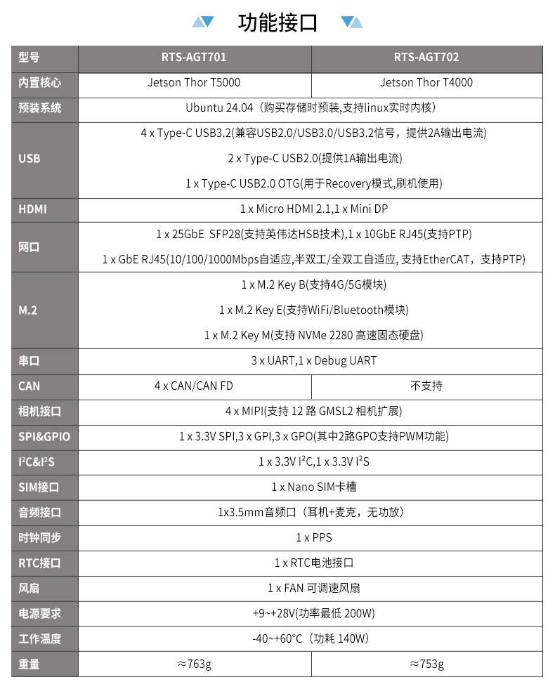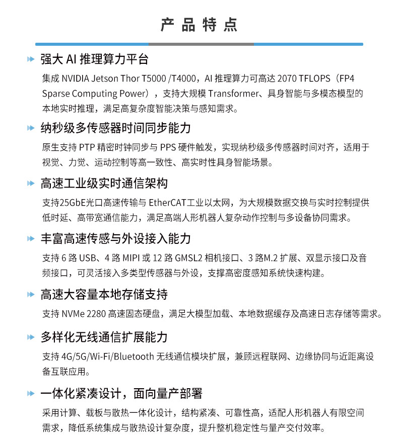 • 产品描述:飞云智算 RTS-AGT700 是瑞泰新时代自研的、面向高端人形机器人与低时延具身智能机器人大脑的一体化计算平台,基于 NVIDIA Jetson Thor T5000/T4000 平台打造,集成高性能载板、计算模组与工业级散热系统,适用于对算力、通信带宽与系统实时性要求更高的具身智能应用场景。