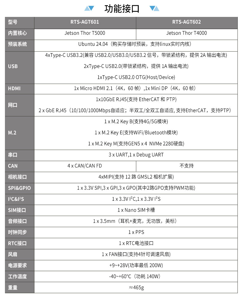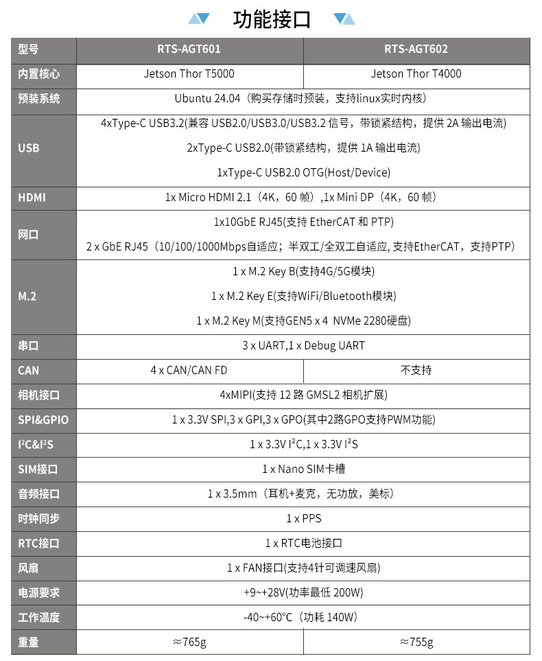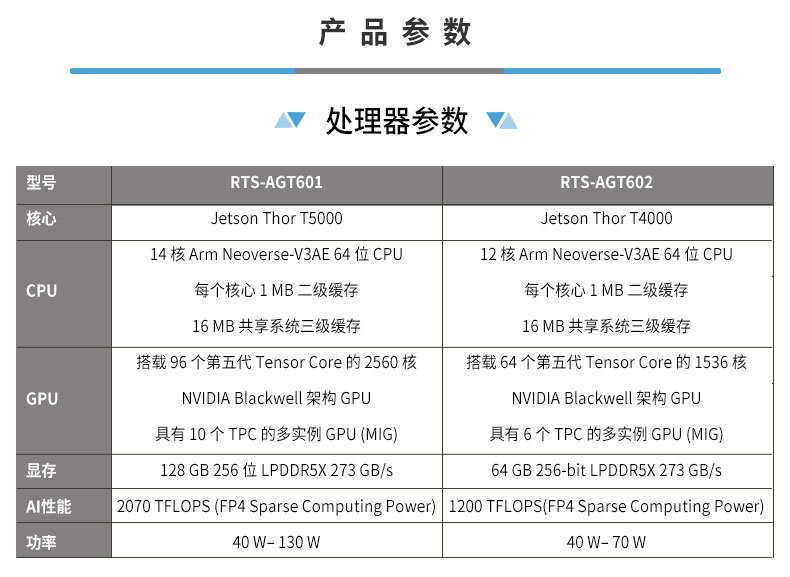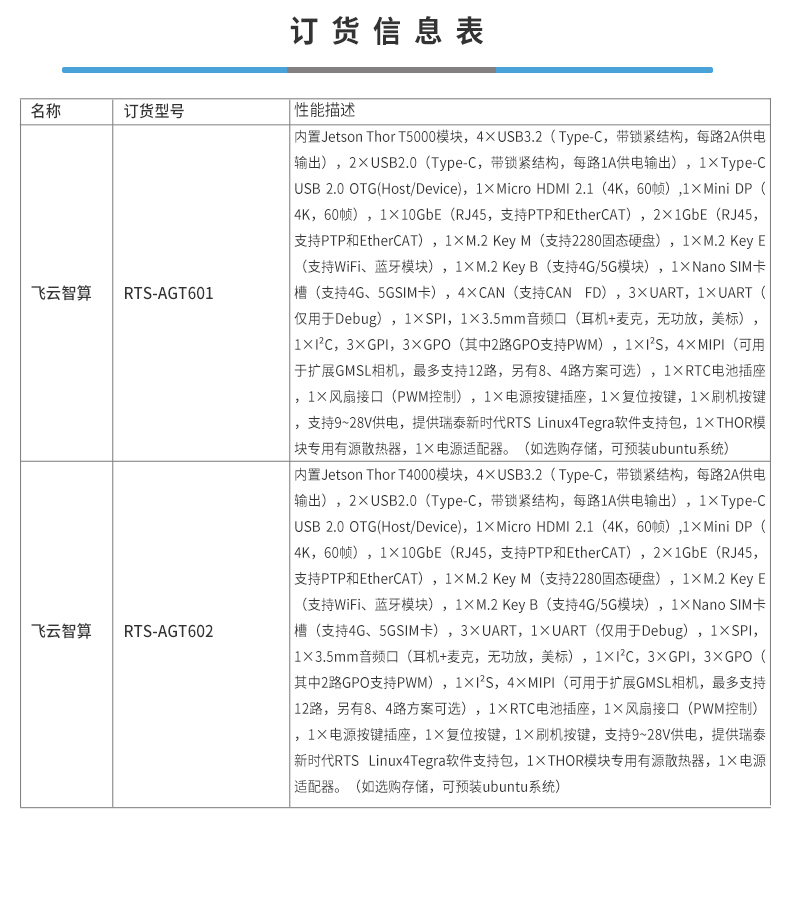 • 产品描述:飞云智算 RTS-AGT600 是瑞泰新时代自研的面向人形机器人和低延时具身智能机器人大脑的计算平台,基于 NVIDIA Jetson Thor T5000 / T4000 平台打造,集成高性能载板、计算模组与工业级散热系统,面向人形机器人与低延时具身智能应用场景。