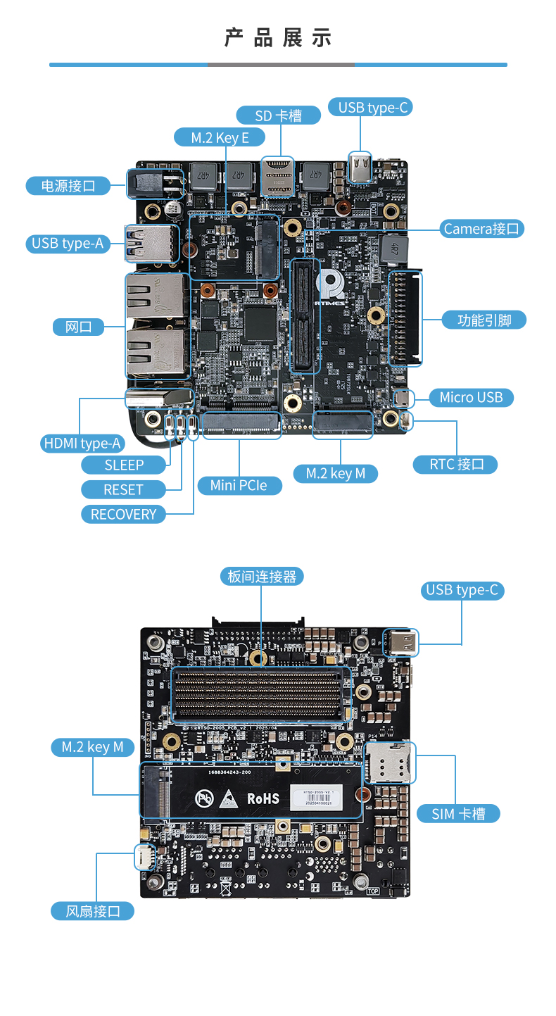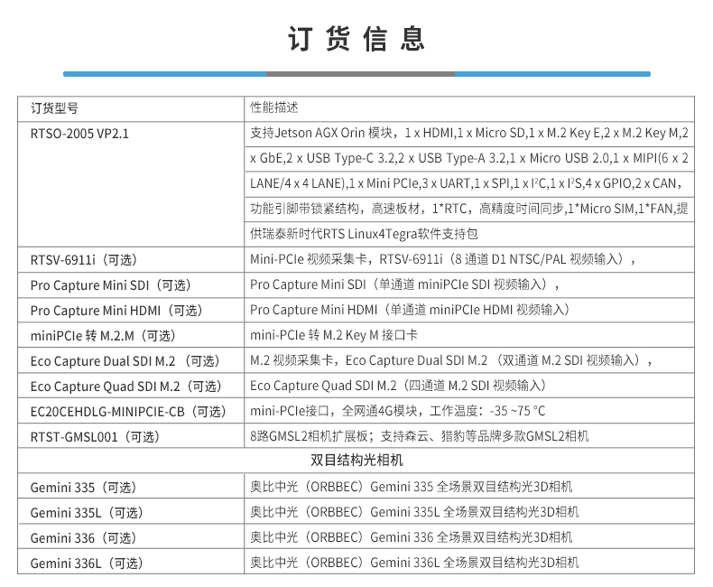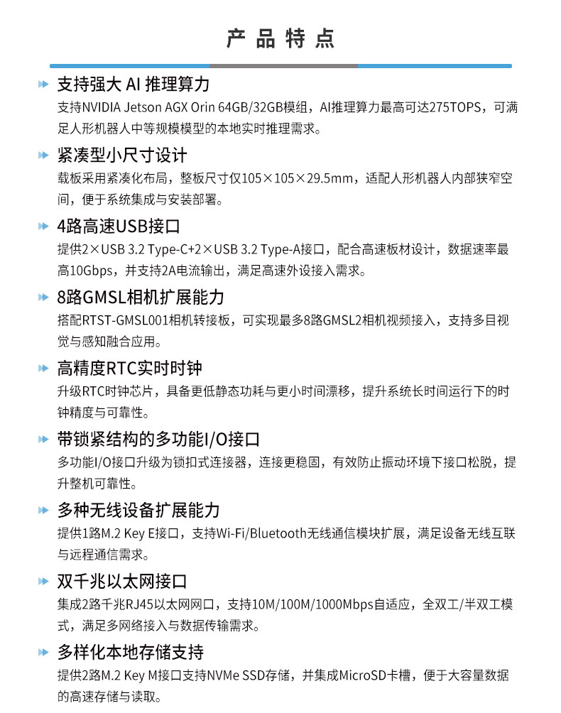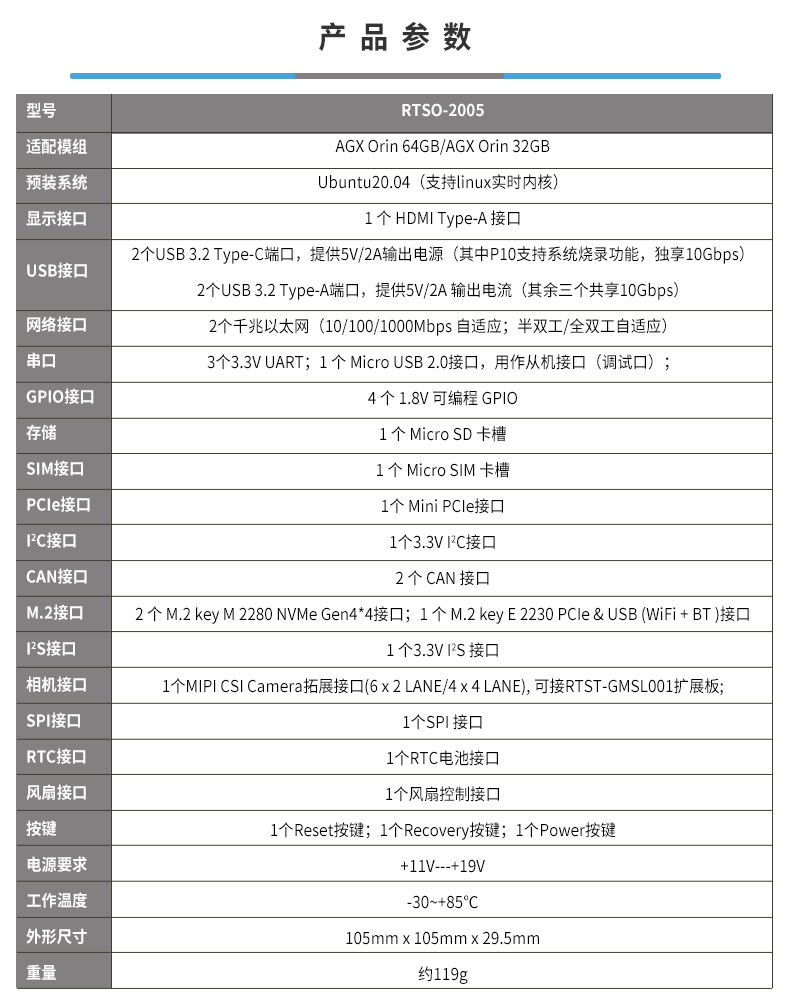 • 产品描述:RTSO-2005 VP2.1 是一款基于NVIDIA Jetson AGX Orin的高性能工业级宽温(-30℃~85℃)高速型载板,面向人形机器人及低延时具身智能应用而设计。产品在提供高达275 TOPS AI推理算力的同时,重点强化了紧凑型小尺寸设计、高速外设扩展能力与系统可靠性,适用于对空间受限、算力与多传感器接入要求较高的机器人应用场景。