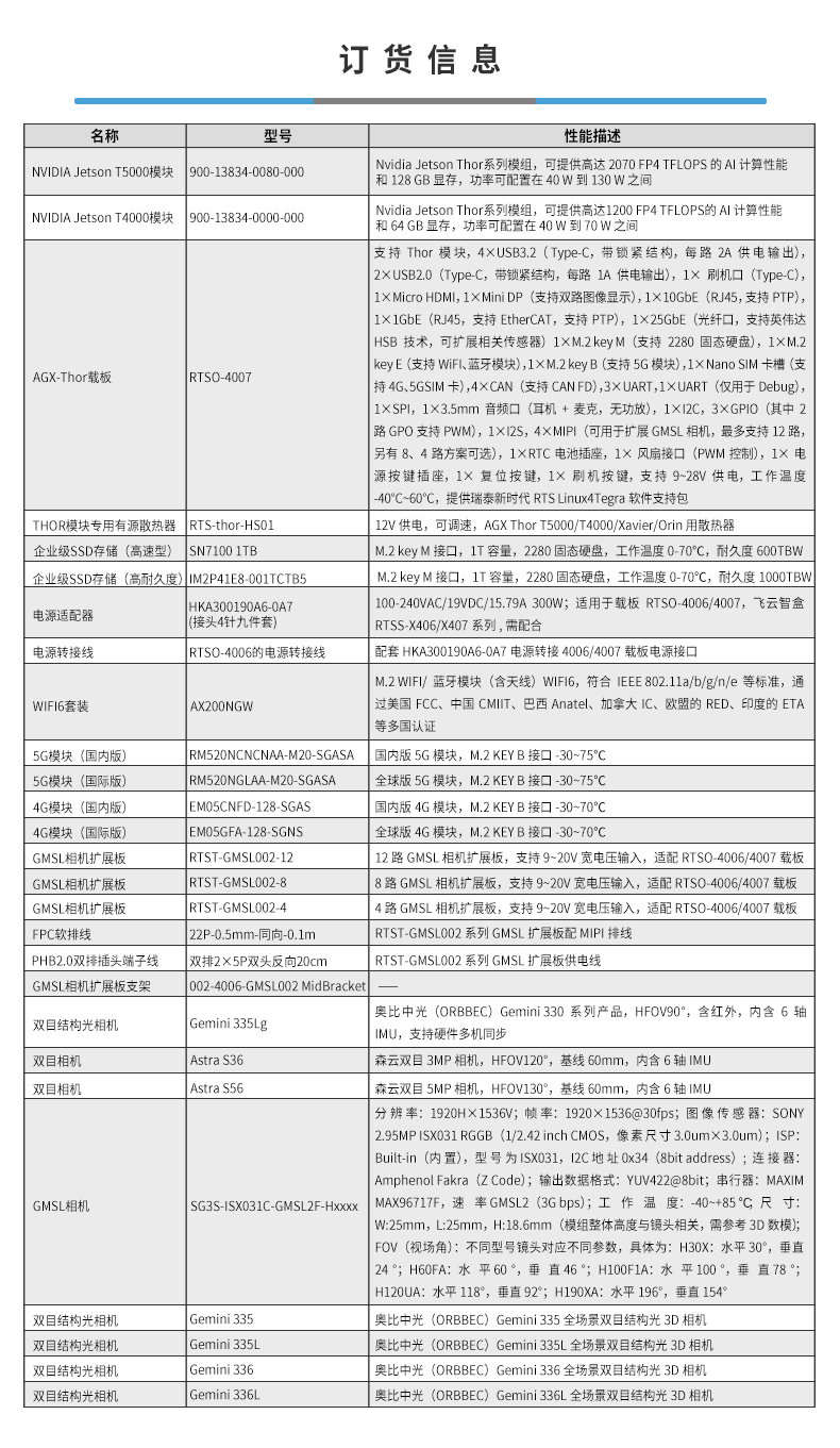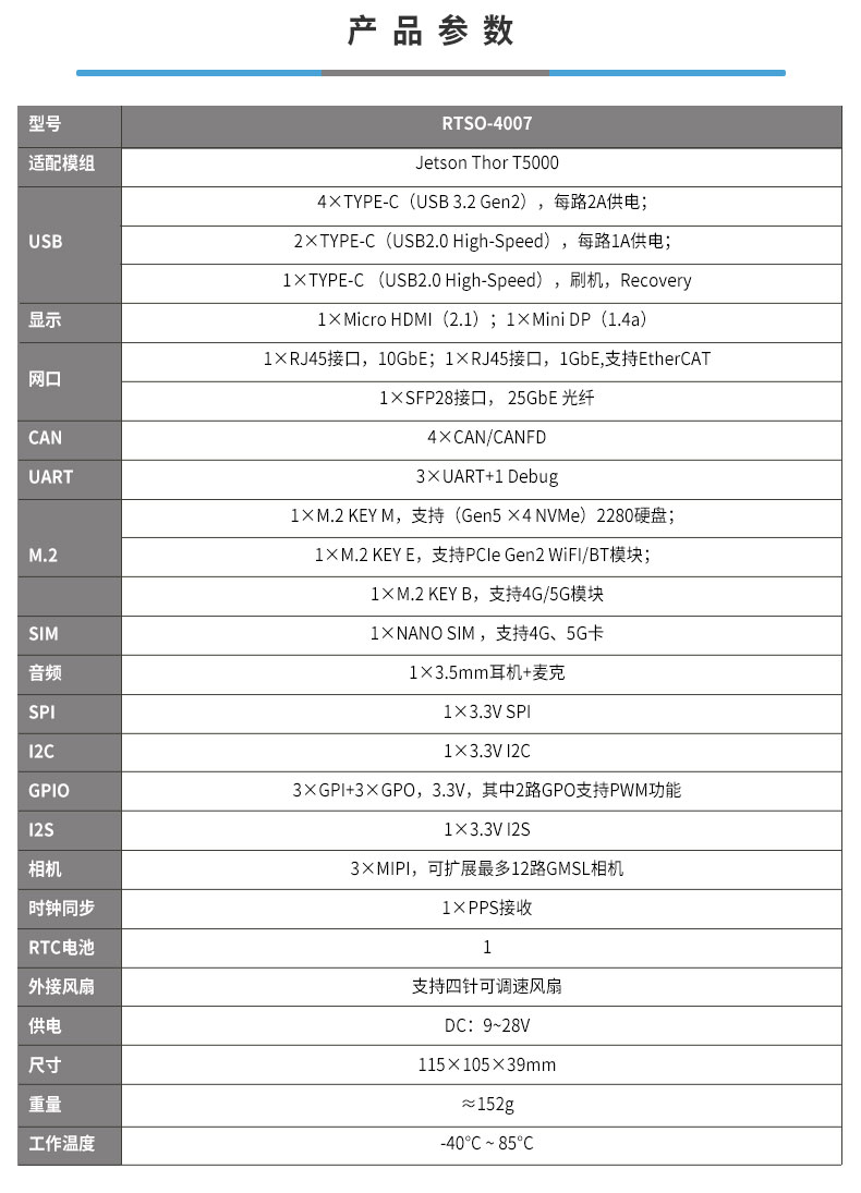 • 产品描述:RTSO-4007是针对NVIDIA Jetson Thor模组的工业级载板,产品集成6路USB、万兆网、4路CAN/CANFD及12路GMSL相机支持等丰富接口,并支持Gen5 NVMe硬盘。其采用紧凑型设计,支持宽压供电(9-28V)并拥有-40℃至85℃的宽温工作能力,确保了工业级的可靠性与耐用性。