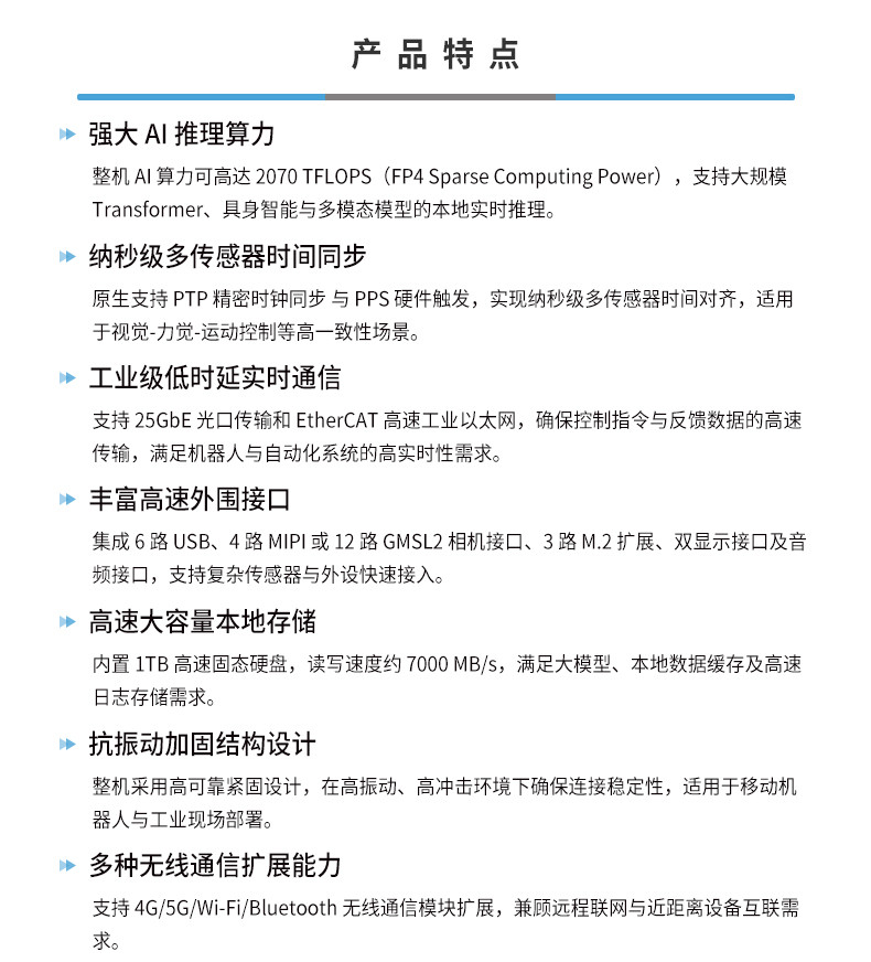 • 产品描述:飞云智盒 RTSS-X407 是一款面向人形机器人与低延时具身智能系统的工业级边缘计算平台,基于NVIDIA Jetson Thor T5000/T4000,提供高达2070 TFLOPS 的 AI 推理算力,支持大型 Transformer 与具身智能模型的本地实时运行。RTSS-X407 兼顾高算力、实时性、可拓展性、大容量存储与可靠性设计,是复杂智能系统的高性能计算平台。