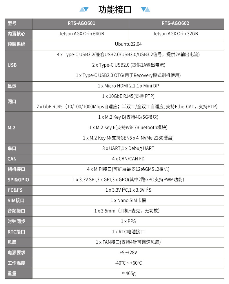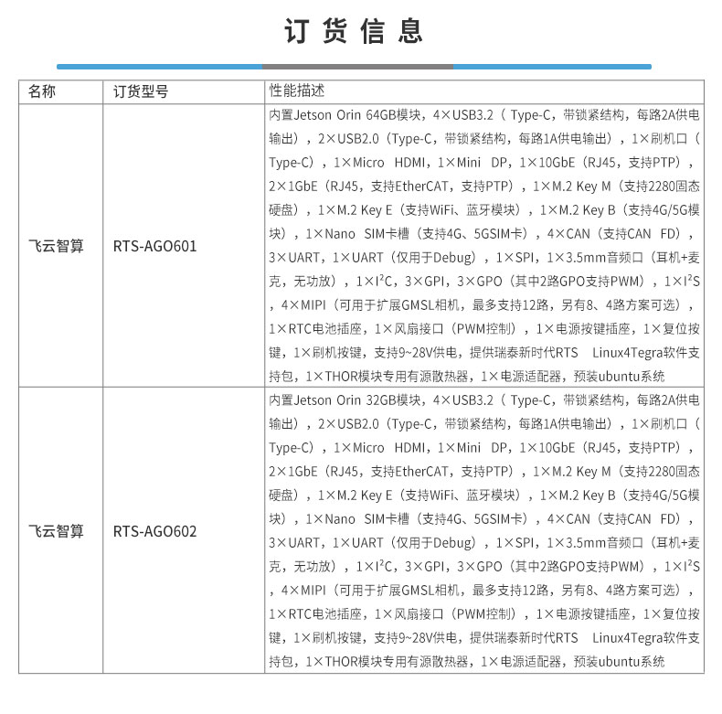 • 产品描述:飞云智算 RTS-AGO600 是瑞泰新时代自研的、面向人形机器人与低时延具身智能机器人大脑 的一体化计算平台,基于 NVIDIA Jetson AGX Orin 平台打造,采用小型化工业级载板设计,集成计算模组与高效散热系统,适用于对体积、重量与系统可靠性要求较高的具身智能应用场景。