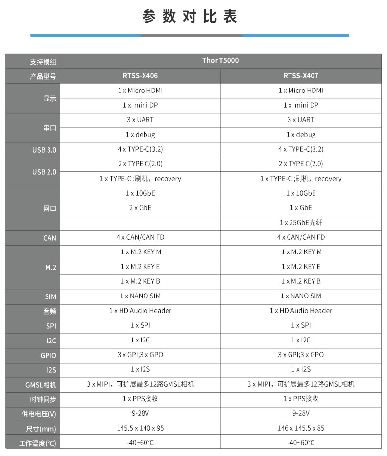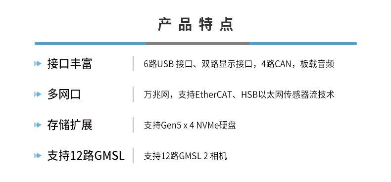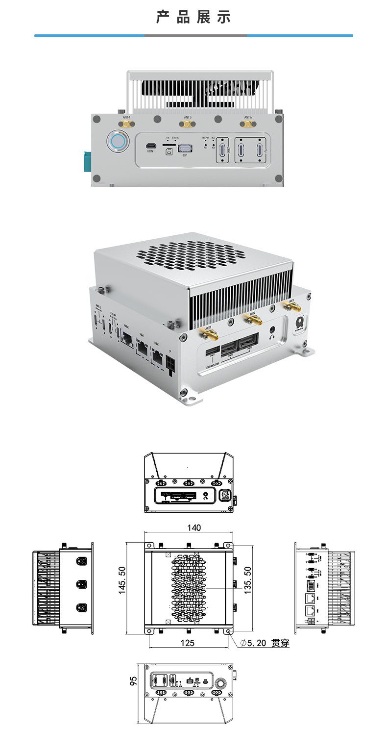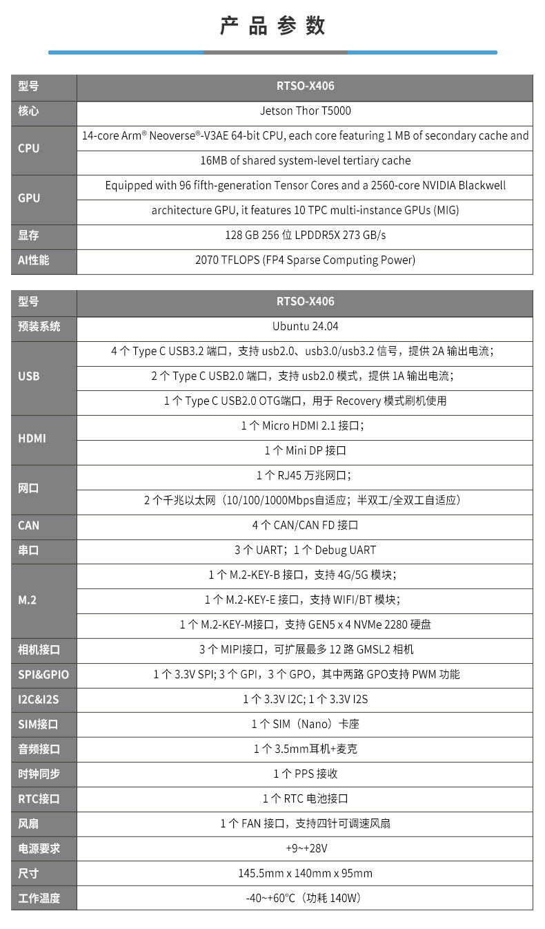 • 产品描述:飞云智盒RTSS-X406是一款由瑞泰新时代推出的高性能边缘计算产品。其核心搭载NVIDIA Jetson Thor T5000模组,提供高达2070 TFLOPS(FP4 - Sparse Computing Power)的强劲AI算力,专为苛刻的工业应用场景设计。产品具备良好的连接性与扩展能力,集成6路USB、万兆网、4路CAN/CANFD及12路GMSL相机等丰富接口,并支持Gen5 NVMe硬盘。其采用紧凑型设计,支持宽压供电(9-28V)并拥有-40℃至60℃的宽温工作能力(功耗140W),确保了工业级的可靠性与耐用性。飞云智盒RTSS-X406是人形机器人、驱动智能制造、智慧物流、特种作业、智慧医疗及科研教育等领域智能化升级的理想硬件平台。