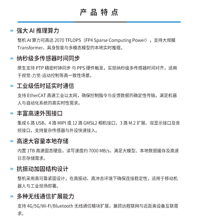 • 产品描述:飞云智盒 RTSS-X406 是一款面向人形机器人与低延时具身智能系统的工业级边缘计算平台,基于 NVIDIA Jetson Thor T5000/T4000,提供高达2070 TFLOPS 的 AI 推理算力,支持大型Transformer 与具身智能模型的本地实时运行。RTSS-X406 兼顾高算力、实时性、可拓展性、大容量存储与可靠性设计,是复杂智能系统的高性能计算平台。