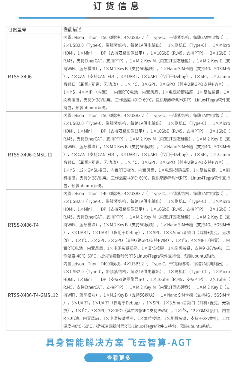 • 产品描述:飞云智盒 RTSS-X406 是一款面向人形机器人与低延时具身智能系统的工业级边缘计算平台,基于 NVIDIA Jetson Thor T5000/T4000,最 高提供 2070 TFLOPS 的 AI 推理算力,支持大型Transformer 与具身智能模型的本地实时运行。RTSS-X406 兼顾高算力、实时性、可拓展性、大容量存储与可靠性设计,是复杂智能系统的高性能计算平台。