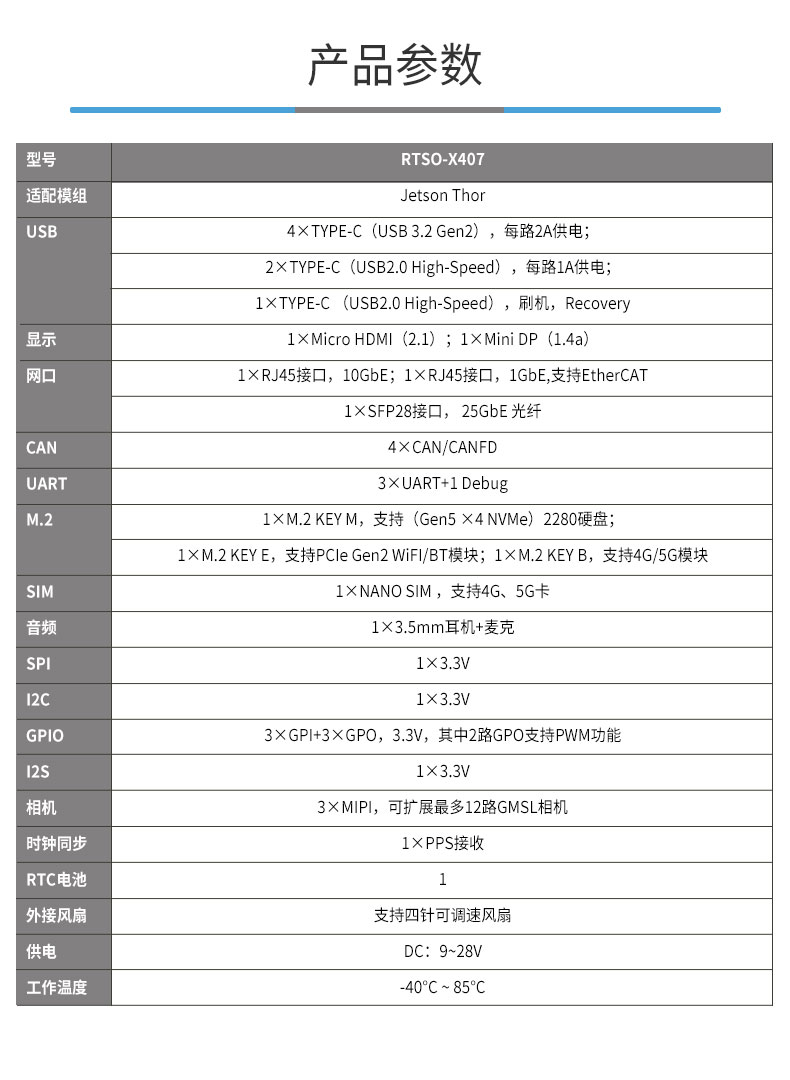 • 产品描述:飞云智盒RTSS-X407是一款由瑞泰新时代(RTIMES)推出的高性能边缘计算产品。其核心搭载NVIDIA Jetson Thor模组,提供高达2070 TFLOPS(FP4稀疏)的强劲AI算力,专为苛刻的工业应用场景设计。产品具备卓越的连接性与扩展能力,集成6路USB、万兆网、4路CAN/CANFD及12路GMSL相机支持等丰富接口,并支持Gen5 NVMe硬盘。其采用紧凑型设计(115×105×70mm),支持宽压供电(9-28V)并拥有-40℃至85℃的宽温工作能力,确保了工业级的可靠性与耐用性。飞云智盒RTSS-X406是人形机器人、驱动智能制造、智慧物流、特种作业、智慧医疗及科研教育等领域智能化升级的理想硬件平台。